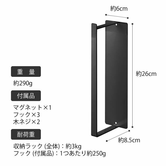 商品名 マグネット洗濯ハンガー収納ラック タワー S 商品詳細 サイズ 約W6×D8.5×H26cm 重量 約290g 耐荷重 収納ラック(全体):約3kg フック(付属品):1つあたり約250g 付属品 マグネット×1 フック×3 木ネジ×2 素材 本体:スチール(粉体塗装) 検索キーワード マグネット洗濯ハンガー収納ラック タワー S tower 洗濯ハンガー 収納 洗濯機 ラック マグネット式 スチール ランドリー収納 スタイリッシュ おしゃれ シンプル 白 黒 yamazaki 山崎実業マグネット洗濯ハンガー収納ラック タワー S 浴室乾燥の方におすすめ! かさばる洗濯ハンガーを 洗濯機横にスマート収納。
